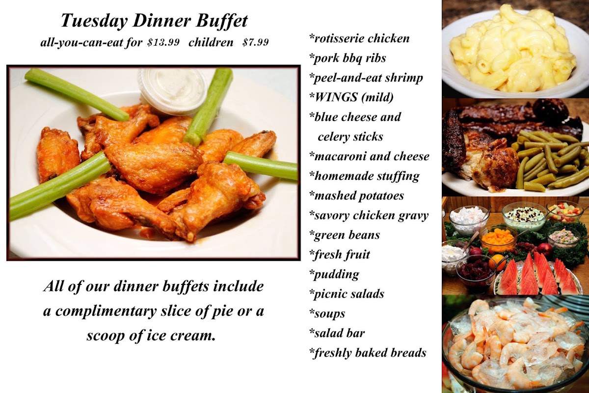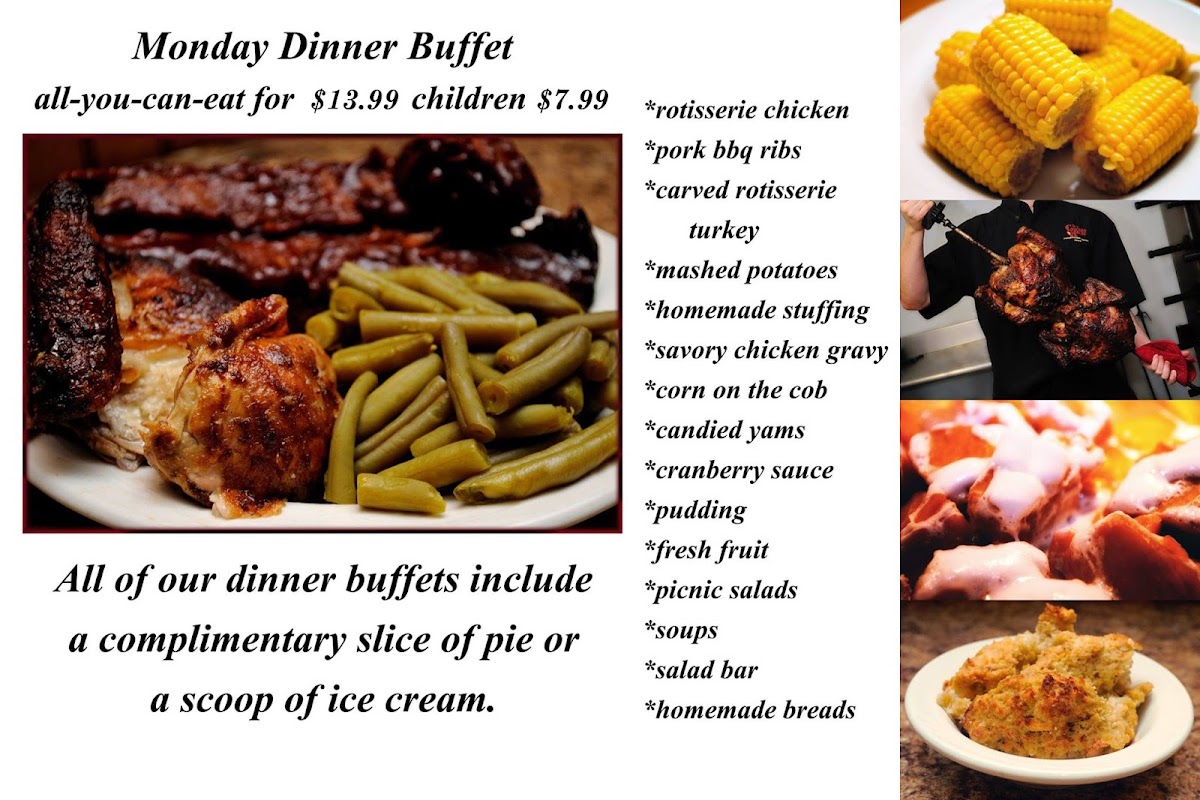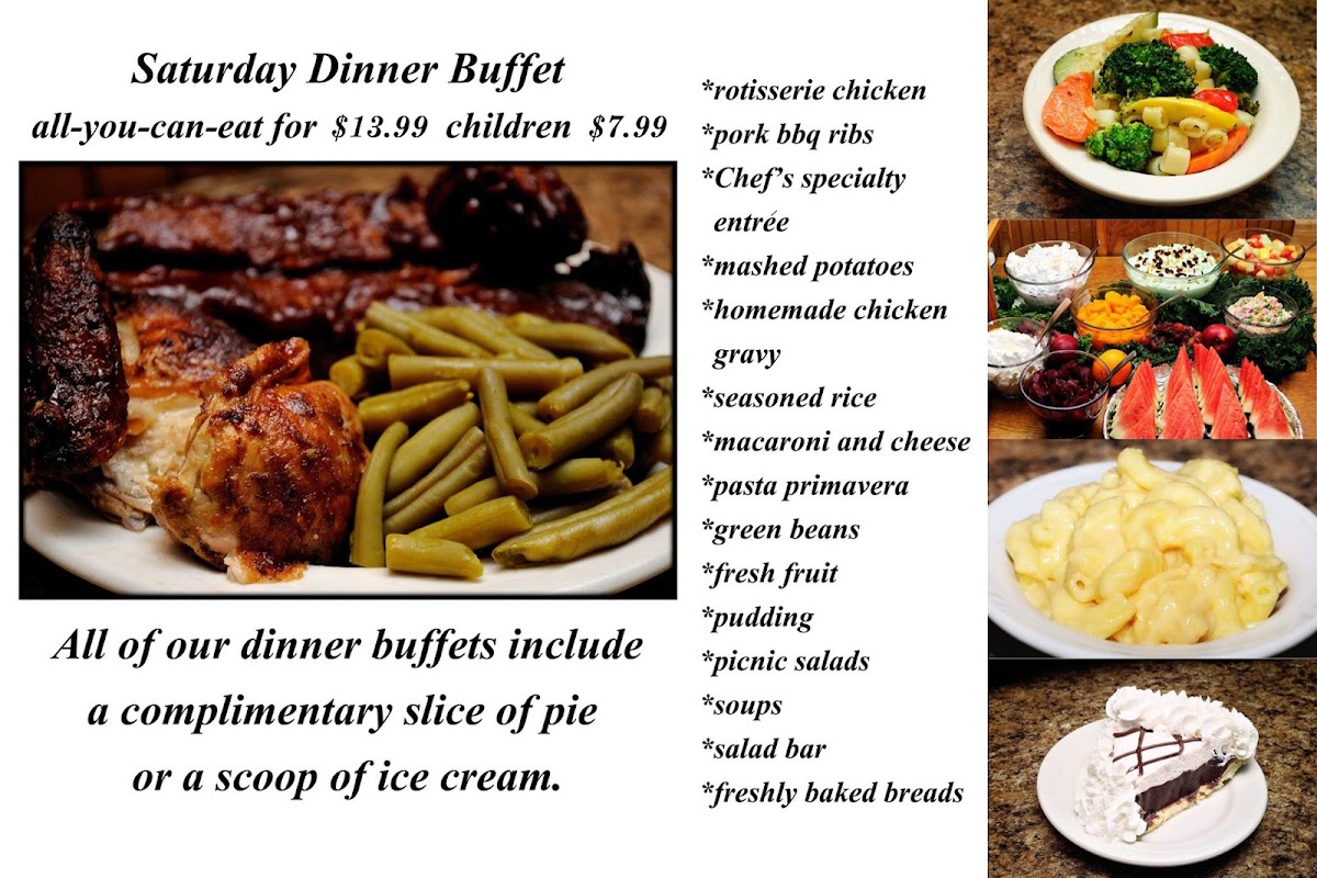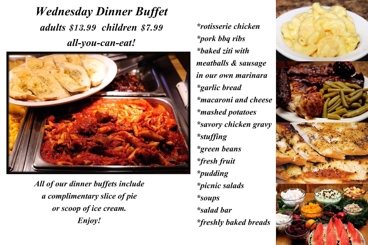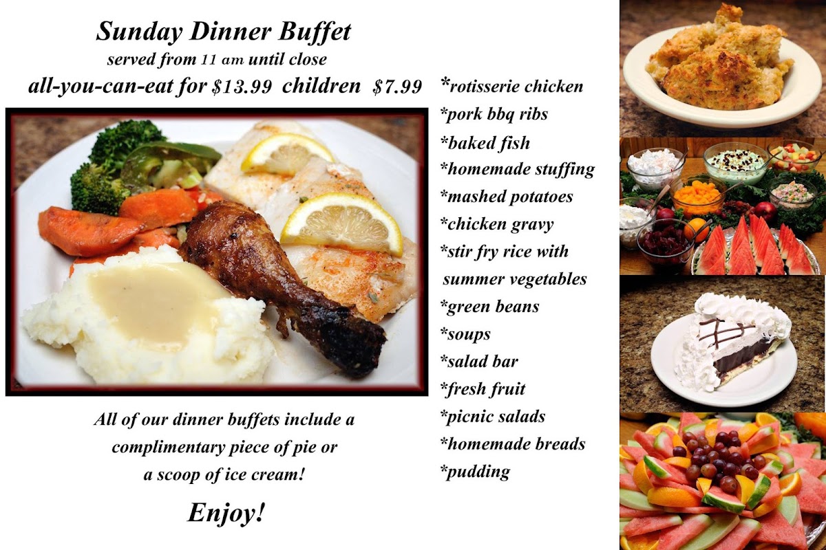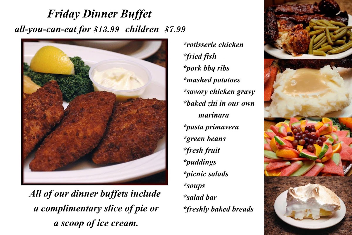 The menu also features a variety of homemade breads and a fresh dessert bar, allowing guests to finish their meal with classic pies like apple and pumpkin, or rich treats such as chocolate creme pie. These familiar flavors enhance the laid-back dining experience, making it feel like a meal shared at the table of a longtime neighborhood spot.
